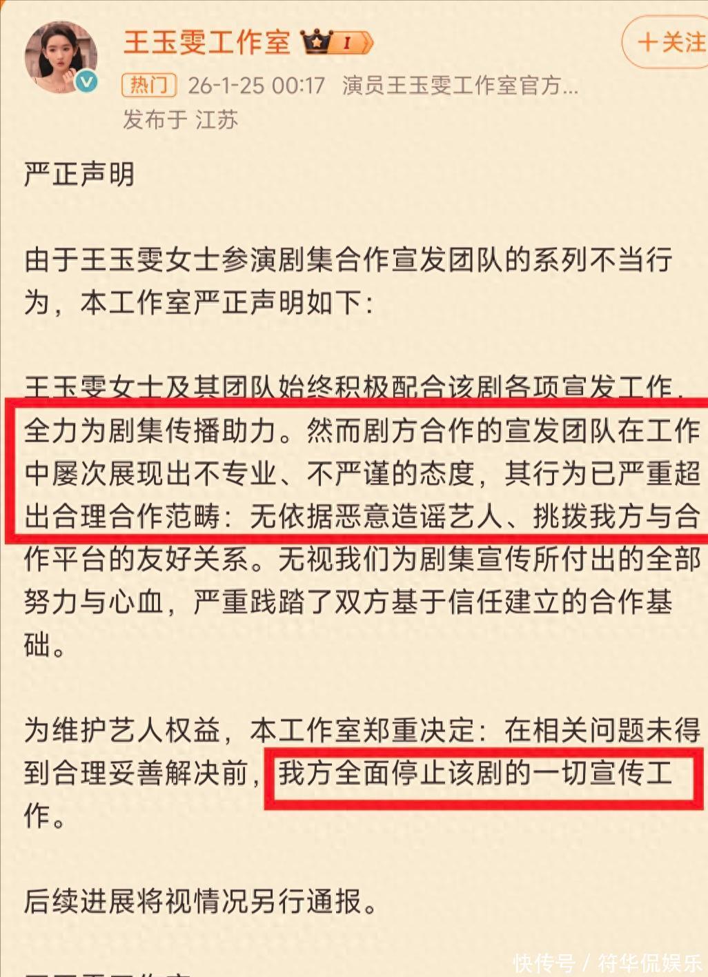 01、停宣背后:宣发团队无理甩锅,艺人忍无可忍王玉雯为啥硬刚?工作室的声明说得很清楚。宣发团队干的事儿,换谁谁都忍不了。王玉雯按要求单日发剧宣内容,宣发团队非但不说好,还无端指责她"违反微博宣发期每日发帖不超3条的潜规则",更离谱的是,他们居然恶意造谣说物料是"艺人自行策划发布",害得合作平台直接向艺人团队问责。