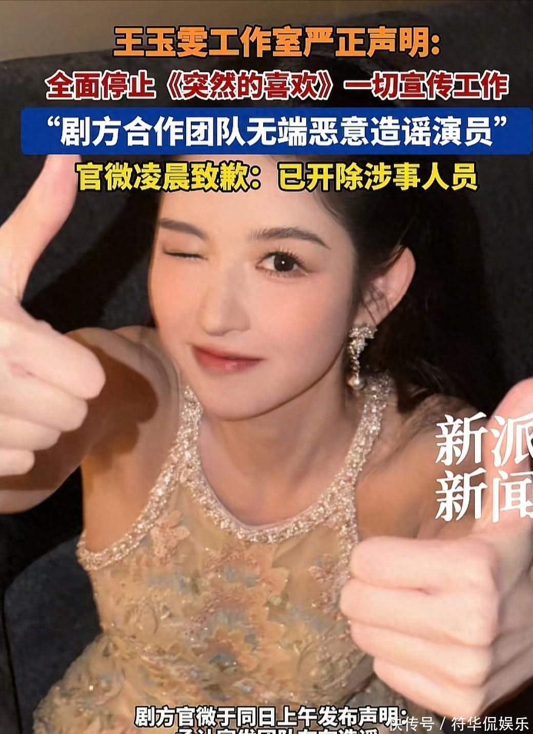 03、剧方光速回应:道歉、开除,态度诚恳但问题未解声明发布才两小时,《突然的喜欢》剧方官微就紧急回应,上演"光速滑跪"。态度明确,措施果断。承认合作宣发团队个别人员存在"无依据造谣艺人、言行失当"的严重问题,尤其指出涉事人员"未与王玉雯接触却私下向平台造谣抹黑艺人人品",对王玉雯及团队造成伤害,致以"最诚挚、最深刻的歉意"。处理措施也很给力。第一时间启动内部调查,已经开除涉事人员,同时终止跟该宣发团队的全部合作,承诺后续会根据调查结果追究相关责任。剧方还表示,会重新梳理宣发流程,确保后续工作严谨合规,同时感谢王玉雯及团队的支持,会跟工作室积极沟通,全力配合解决问题,以诚恳态度寻求谅解。