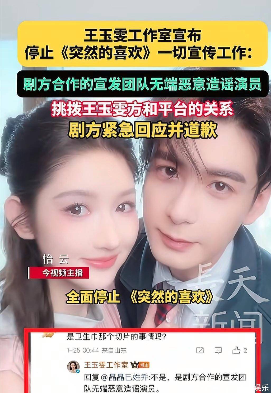 这大概是今年最炸裂的"午夜大戏"了。1月25日凌晨4点,王玉雯工作室突然发声明,宣布全面停止《突然的喜欢》一切宣传,矛头直指剧方合作的宣发团队。谁也没想到,剧方反应这么快,两小时后就回应道歉,直接开除涉事人员,这场深夜"光速滑跪",看得人直呼过瘾。